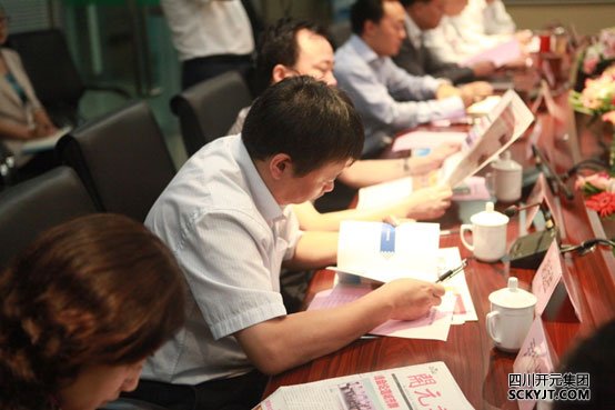 會(huì)領(lǐng)導(dǎo)認(rèn)真閱讀著集團(tuán)文化宣傳手冊與開元報(bào)